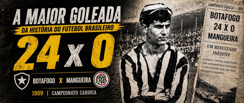 Descubra como aconteceu a maior goleada da história do futebol brasileiro. Em 1909, o Botafogo venceu o Mangueira por 24x0 pelo Campeonato Carioca, com um jogador marcando 9 gols em um único jogo.